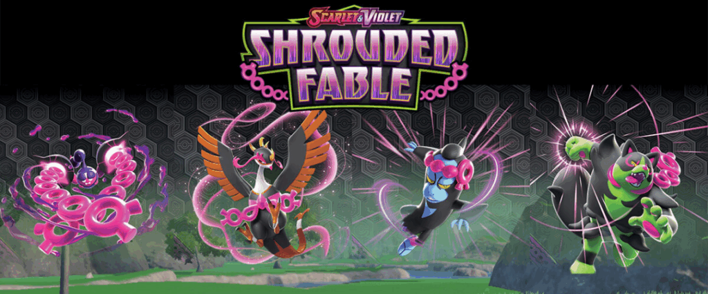 Plotki krążą, a wspomnienia mylą, gdy w krainie Kitakami nieubłaganie upływa czas! Przygotuj się na nadejście nocy i odkryj złowrogą obecność, gdy Pecharunt ex dowodzi Lojalną Trójką — Okidogi ex, Munkidori ex i Fezandipiti ex — aby wykonywały jego nikczemne rozkazy. Tymczasem Revavroom ex podłącza się do sieci, by Terastalizować się w typ Elektryczny, a Kingdra ex robi królewskie zamieszanie w dodatku Pokémon TCG: Scarlet & Violet—Shrouded Fable!