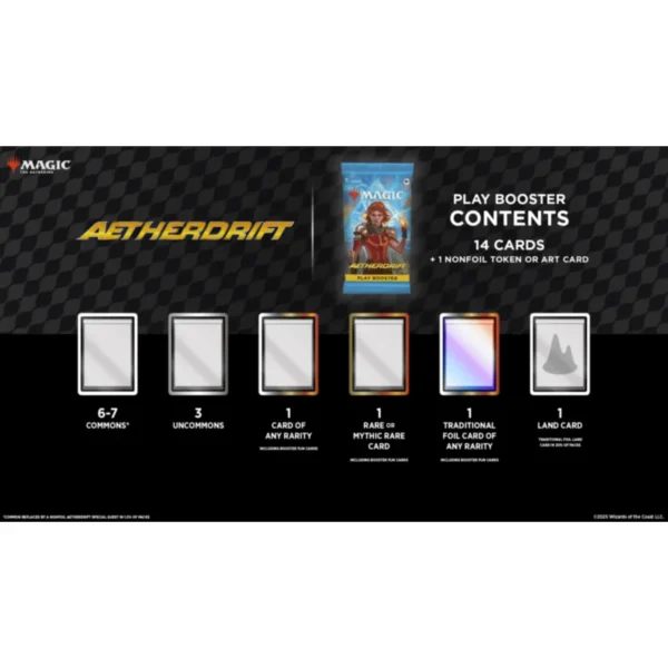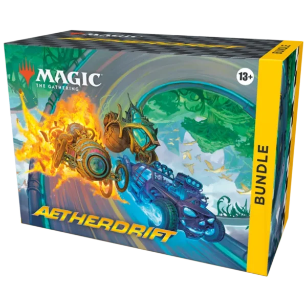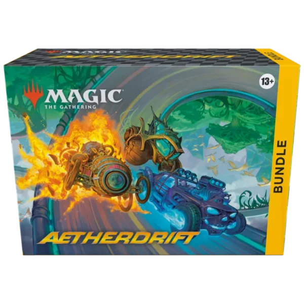 Zestaw MTG: Aetherdrift – Bundle zawiera 9 Play Boosterów i kartę traditional foli w wariancie Bundle-exclusive altenate-art. Do tego 40 kart Basic Landów. 20 z nich są w wydaniu traditional foil. W pudełku bunda znajdziesz też duży licznik życia i dwie karty referencyjne.