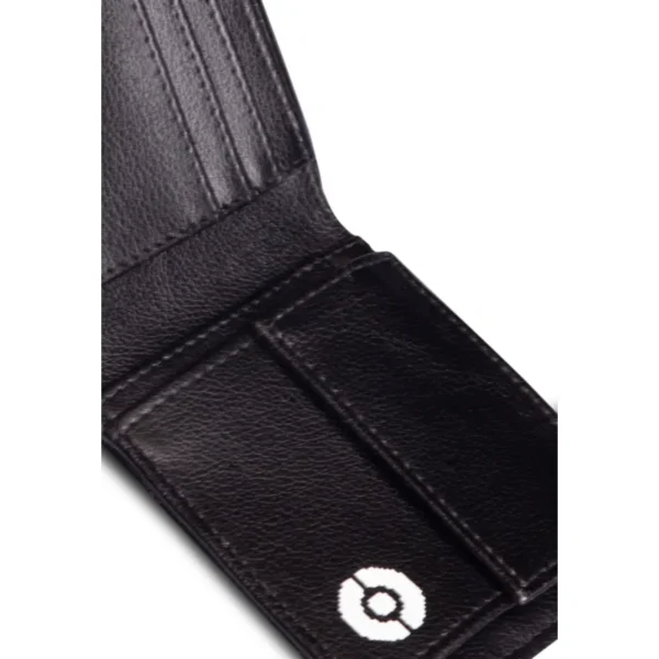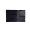 Wewnątrz portfel jest w kolorze czarnym. Posiada przegródki na karty i przegródkę na banknoty oraz oddzielną przegródkę na monety z ukrytym zatrzaskiem.