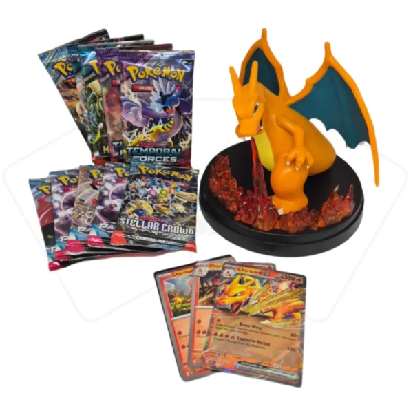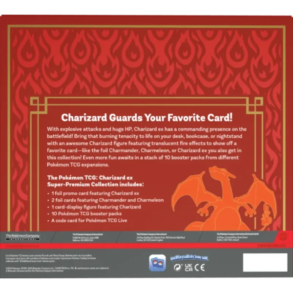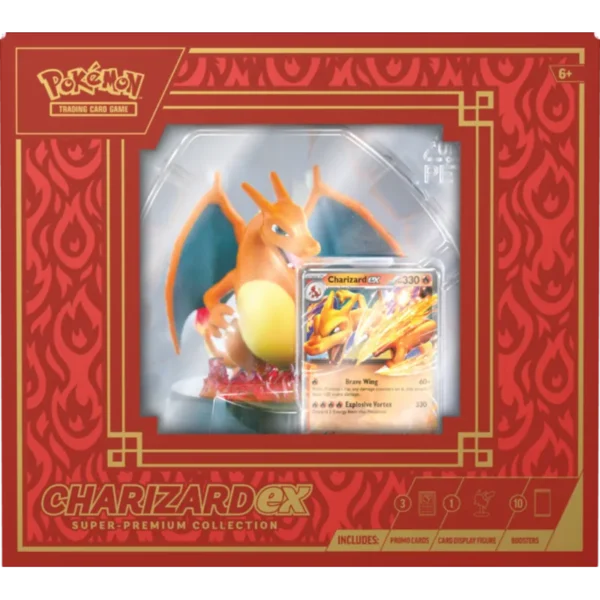 Zestaw Charizard ex Super Premium Collection zawiera figurkę Charizarda, kartę promo z Charizardem ex, dwie karty foil z Charmanderem i Charmeleonem, dziesięć boosterów Pokémon TCG oraz kod do gry Pokémon TCG Live.