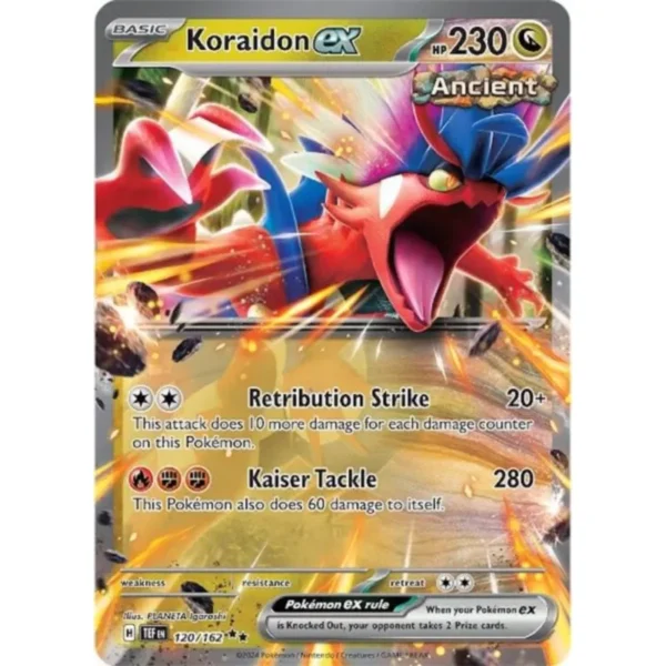 Talia ta bazuje na energii Ognistej i Walczącej. Pokémony jakie znajdziesz w talii to Koraidon ex, Sandy Shocks ex, Koraidon, Sandry Shocks oraz Great Tusk.