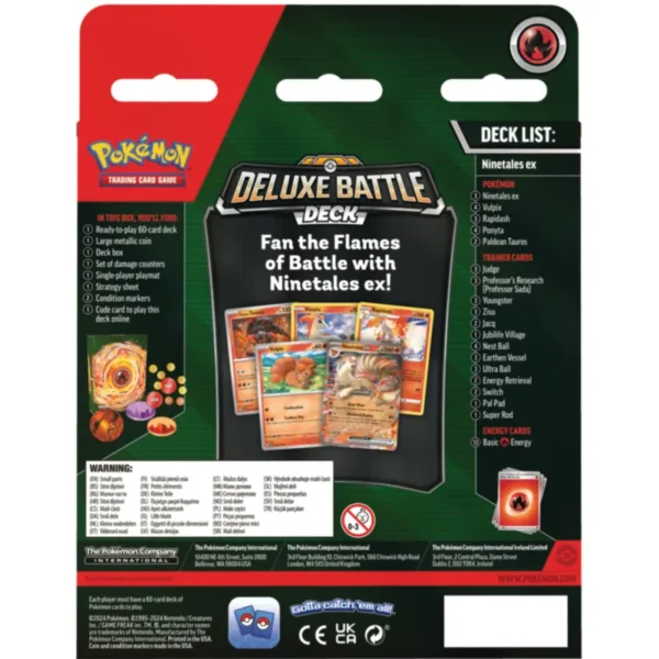 Gotowa do gry talia z Ninetales ex na czele czeka na Ciebie. Składa się ona z 60 kart, pudełka na talię oraz znaczników i monety, które przydadzą się podczas gry. Dzięki dołączonej planszy do gry z łatwością możesz wkroczyć na pole bitwy.