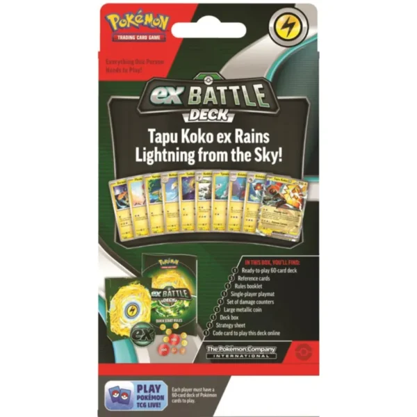 Zestaw ex Battle Deck Tapu Koko ex zawiera wszystko czego potrzebujesz do gry. W środku znajdziesz gotową do gry talię składającą się z 60 kart, broszurkę z zasadami, papierowa mata do gry dla jednego gracza, zestaw znaczników obrażeń oraz moneta do gry. Pudełko na talię do przechowywania kart oraz broszurka ze strategią gry tą talią.