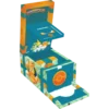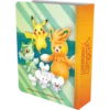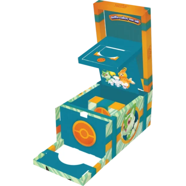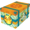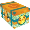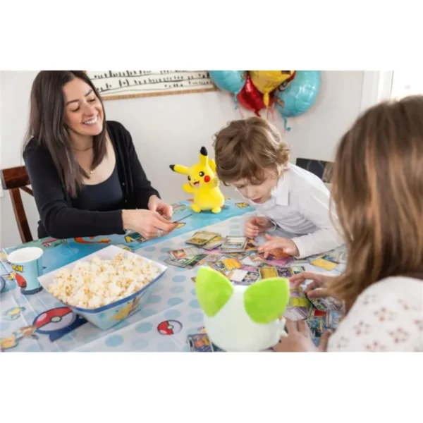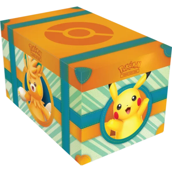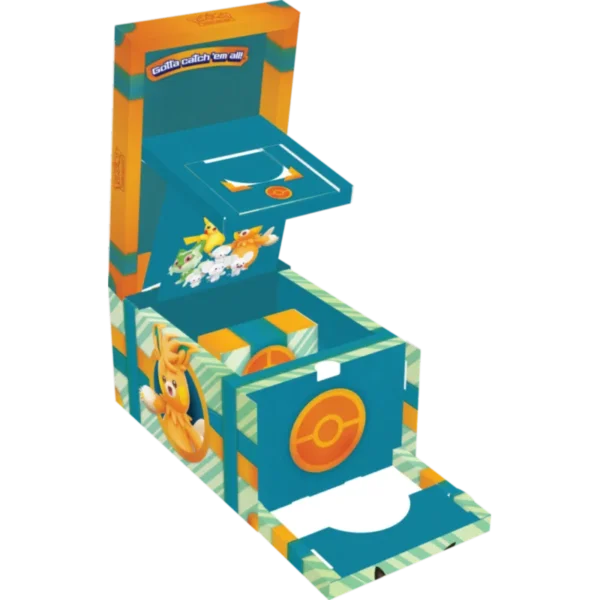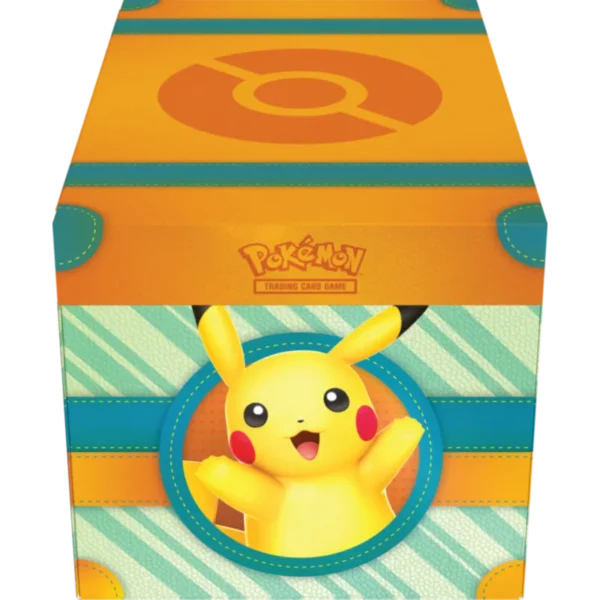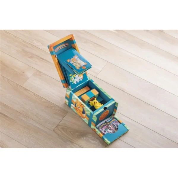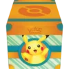 Pudełeczko pełne ciekawych dodatków. W środku znajdziesz 7 kart promo do tego arkusz naklejek, miniportfolio, miękka zabawka Pikachu i 6 boosterów Pokémon TCG.