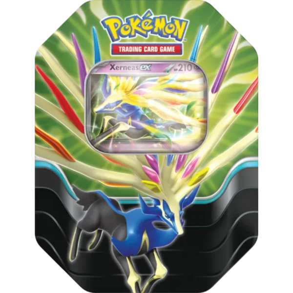 Puszka zawiera kartę promo foil z Xerneas ex oraz 4 boostery Pokémon TCG i kartę kodu Pokémon TCG Live.
