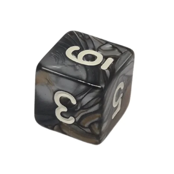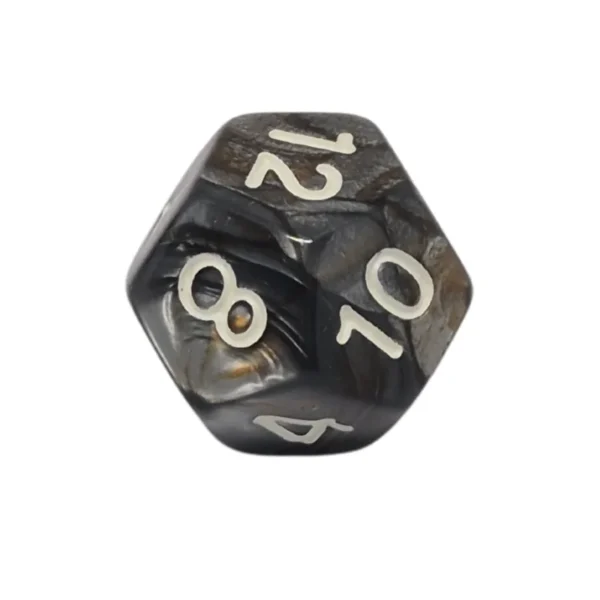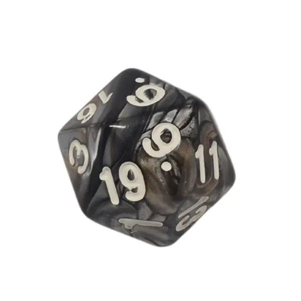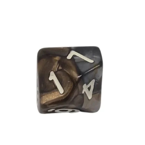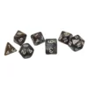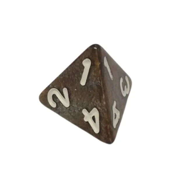 Zestaw 7 kości do gier RPG w kolorze brązowo szarym, z białymi cyframi.
