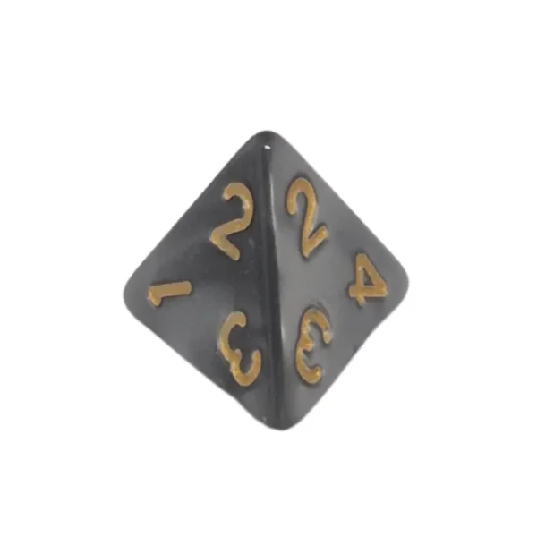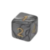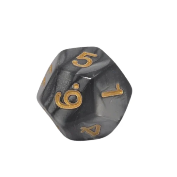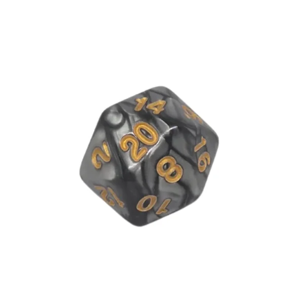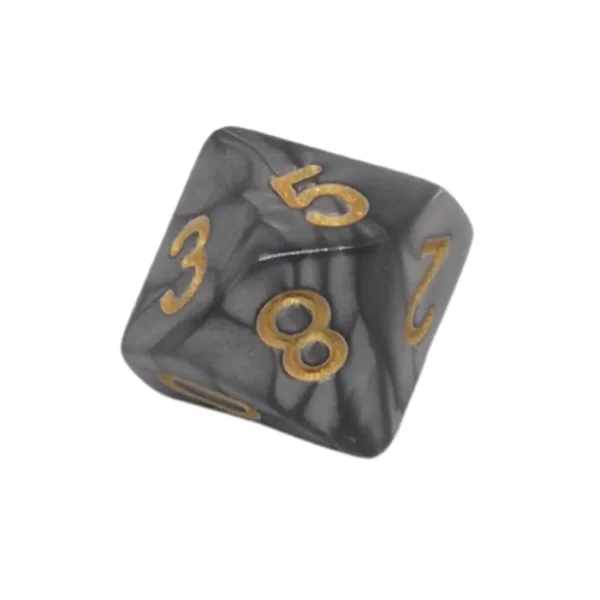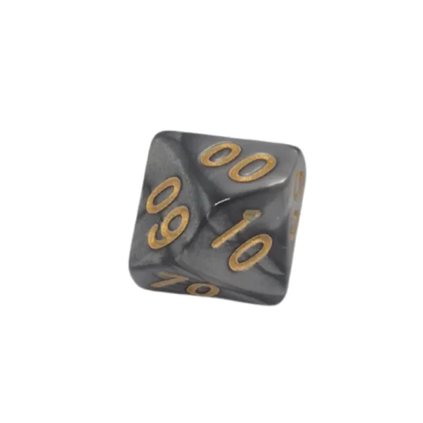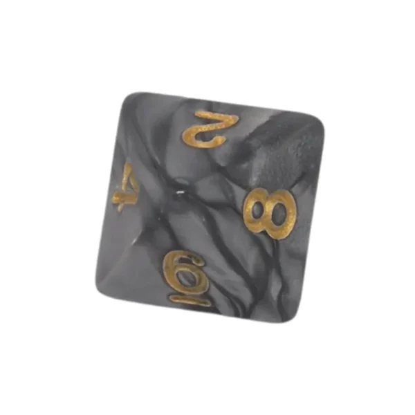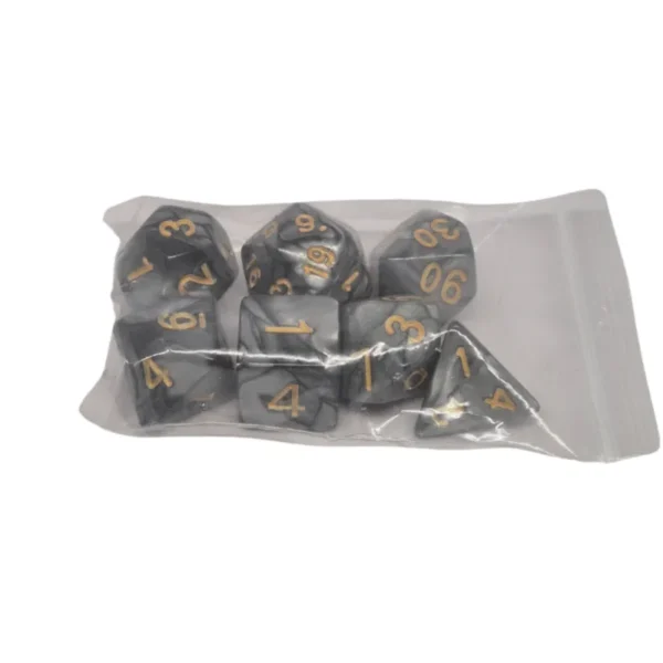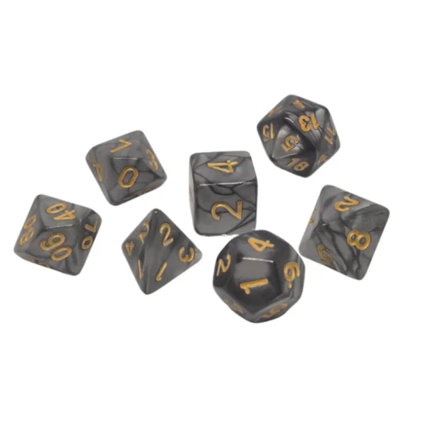 Zestaw 7 kości do gier RPG w kolorze szarym z domieszką białego przez co przypomina dym z fajki, ze złotymi cyframi.