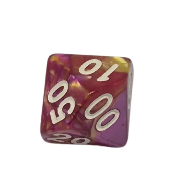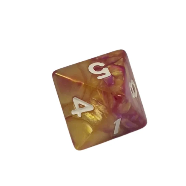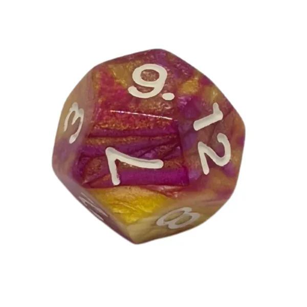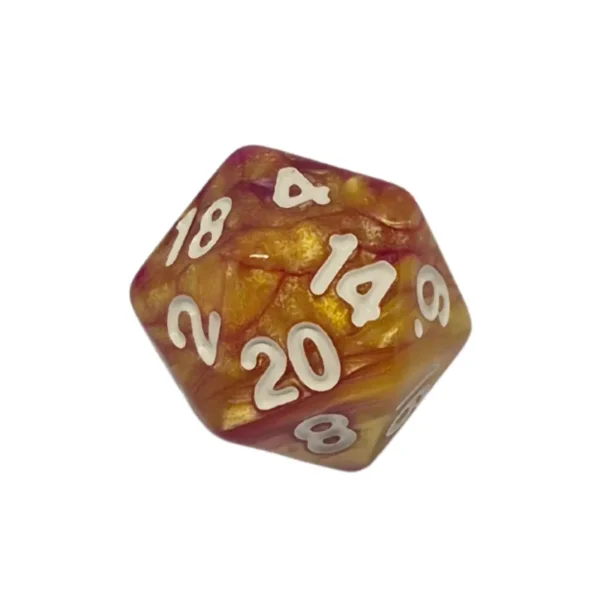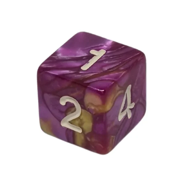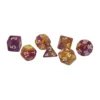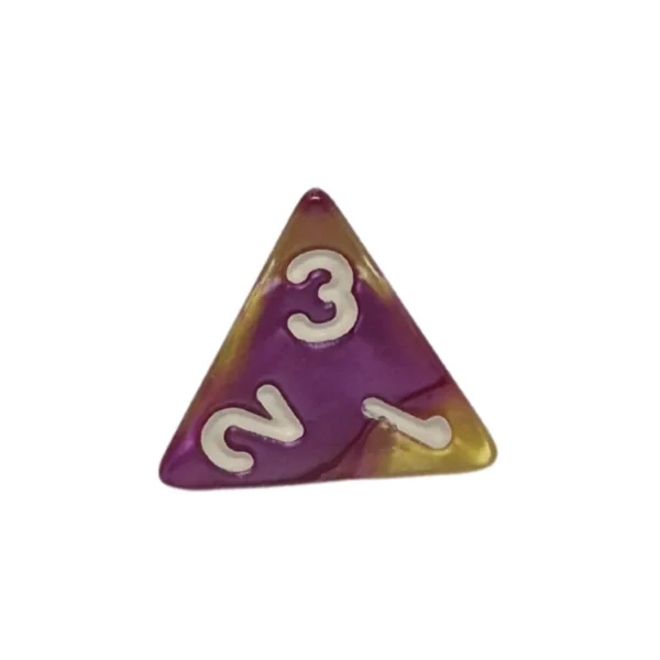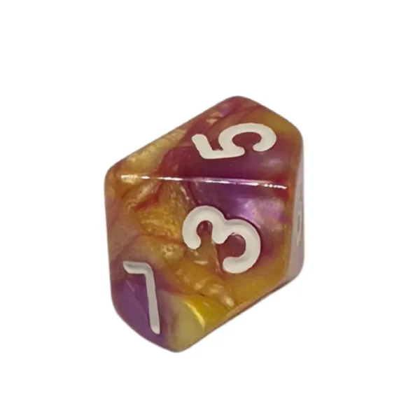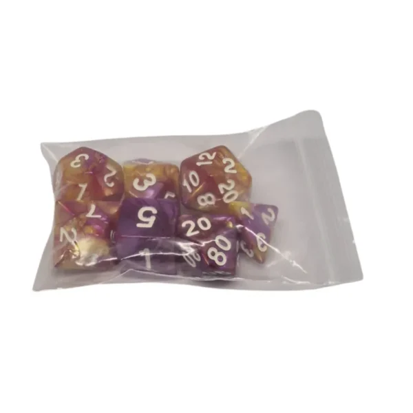 Zestaw 7 kości do gier RPG w kolorze zółto fioletowym, z białymi cyframi.